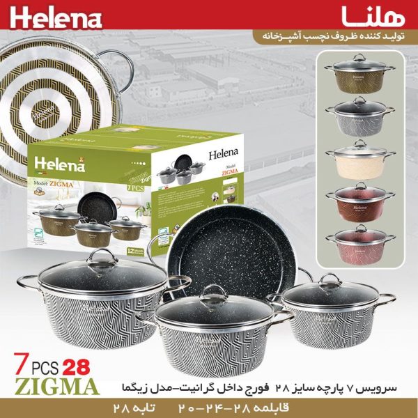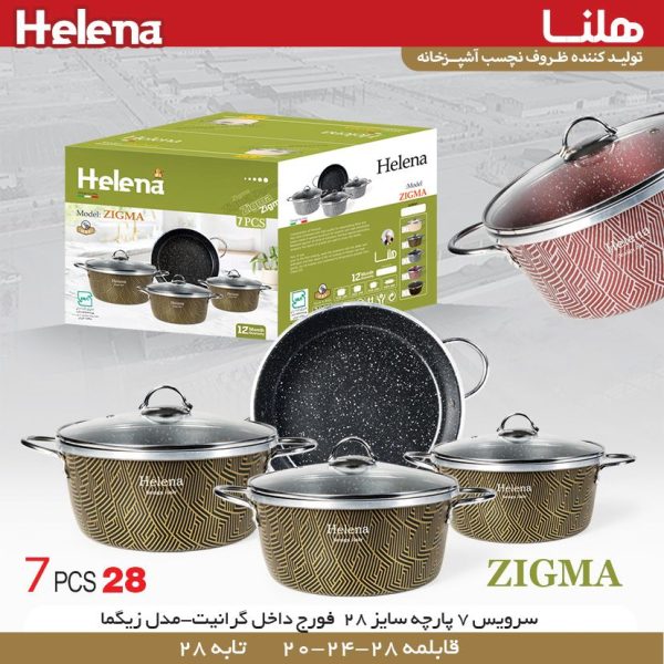 The Zigma model service includes pots of sizes 20-24-28 and a pan of size 28
